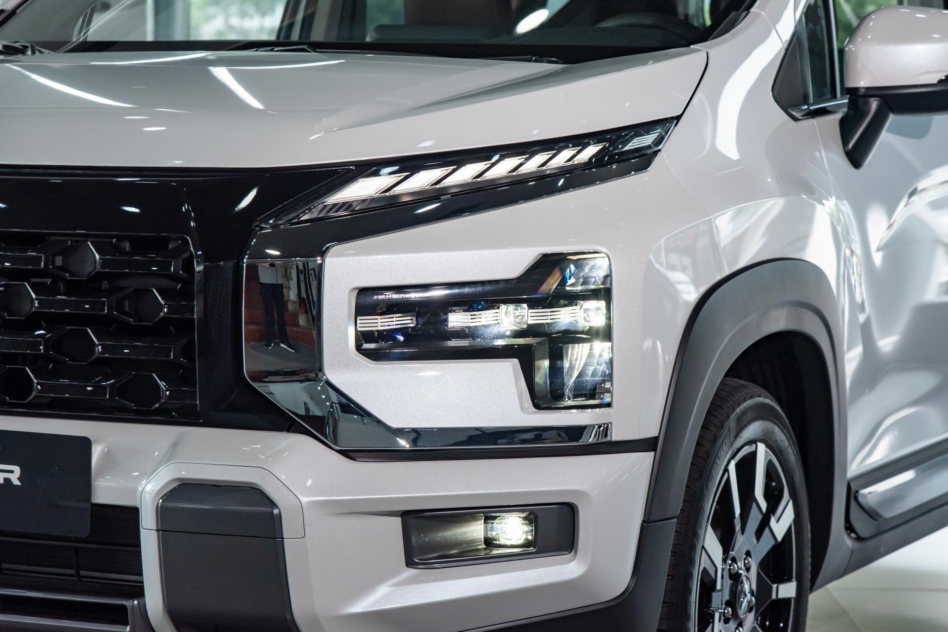Diện mạo phía trước trở nên cơ bắp và hầm hố hơn hẳn. Lưới tản nhiệt được lấy cảm hứng trực tiếp từ mẫu SUV Mitsubishi Xforce, với các nan to bản sơn đen khỏe khoắn. Cụm đèn pha được làm tối màu, cản trước được thiết kế lại trông vuông vức và mạnh mẽ hơn, đi kèm với tấm ốp gầm màu bạc nổi bật. Đặc biệt, Xpander Cross là phiên bản duy nhất được trang bị đèn sương mù dạng LED.