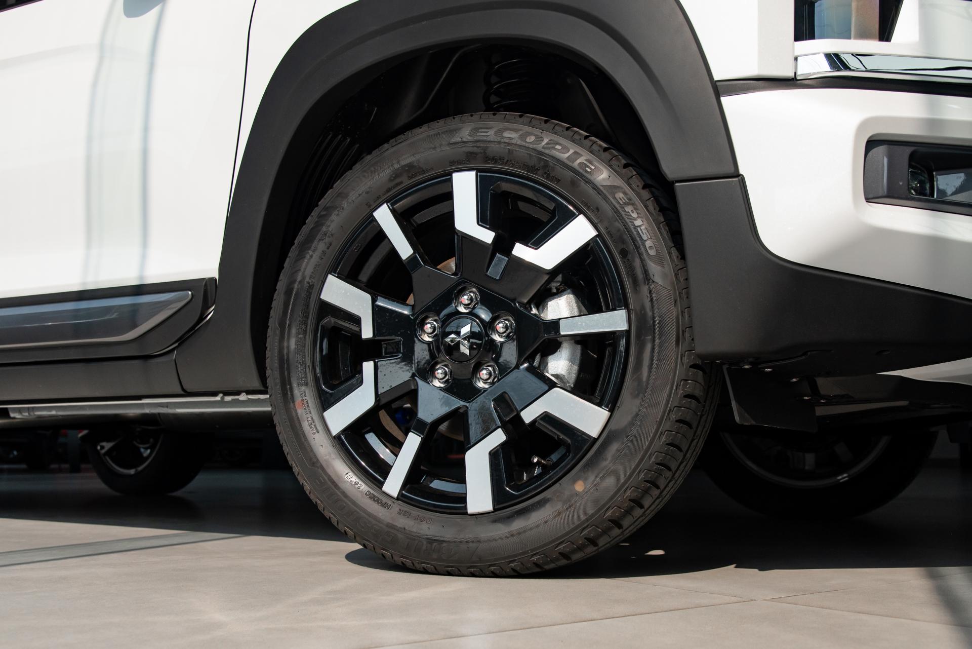 Phong cách SUV được nhấn mạnh qua các chi tiết như ốp cua bánh xe sơn đen và thanh giá nóc khỏe khoắn. Tương tự bản AT Premium, Xpander Cross 2025 cũng sở hữu khoảng sáng gầm xe ấn tượng 225 mm, cao nhất phân khúc, mang lại khả năng di chuyển linh hoạt trên địa hình khó và lội nước tốt hơn. Xe được trang bị bộ mâm hợp kim 17-inch với thiết kế riêng, mạnh mẽ và thể thao.